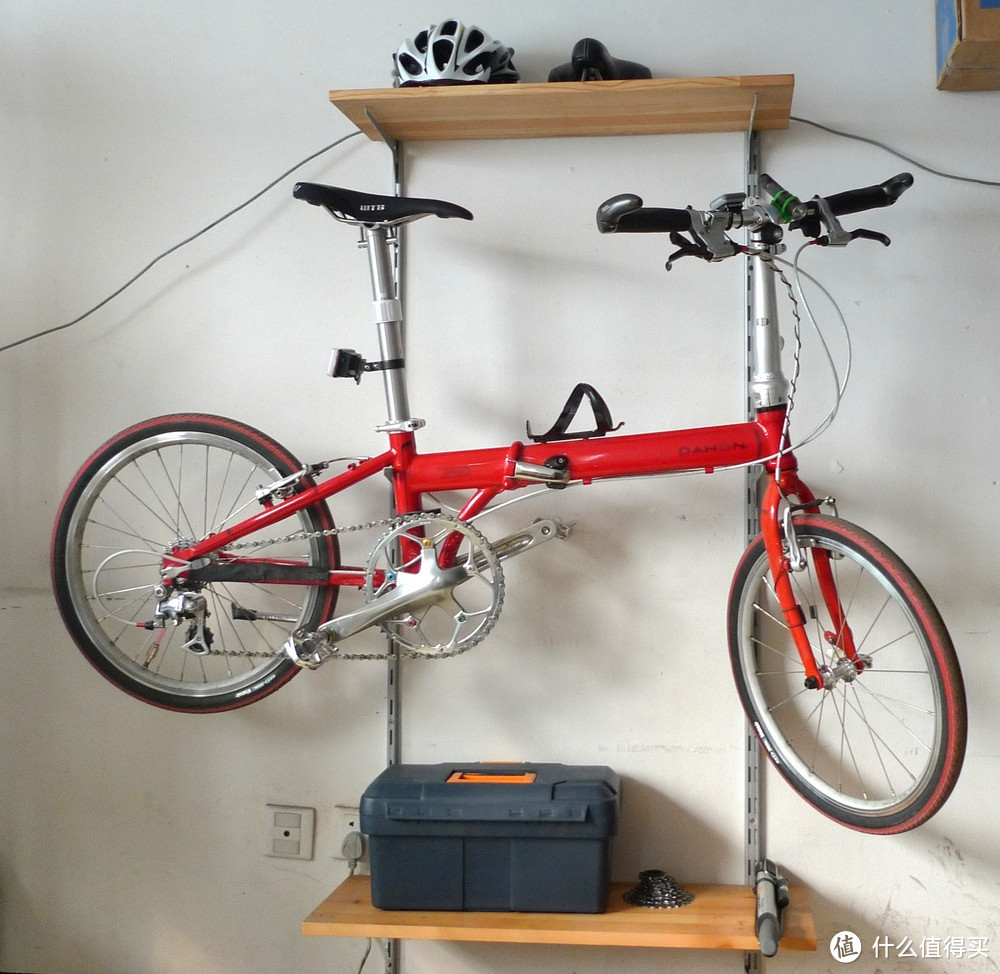 这是我的第一个运动自行车大行SP8,当时还住在公司宿舍,并没有挂自行车的需求,感觉碍事的时候折叠起来就行了。这是当时骑行群里有人讨论自行车挂墙时候随手挂上拍个照而已。这个不是真正的挂车架,而是我装墙上的墙轨和支架,平常搭上搁板充当书架和货架使用的。下面开始介绍我使用过和了解过的挂架。